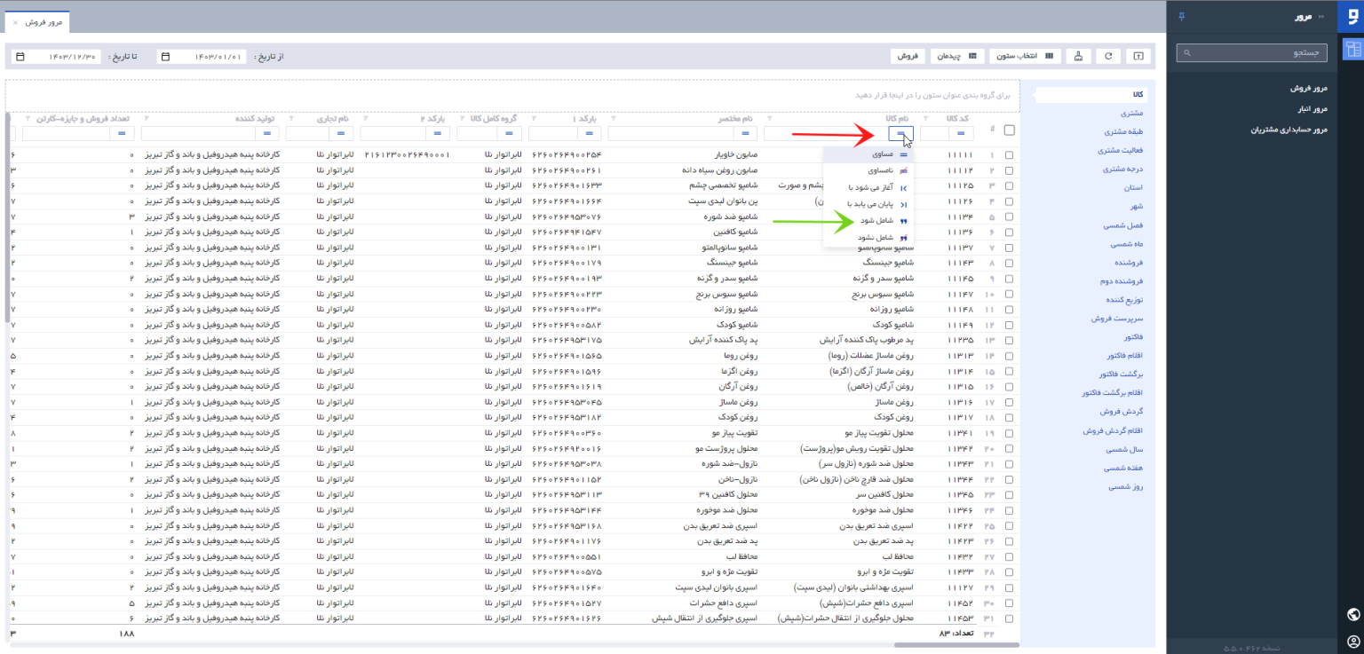 نکته! برای راحتی جست و جو لطفا در کادر جست و جوی ستون مورد نظر ( با نشانگر قرمز مشخص شده است)، گزینه شامل شود (مشخص شده با فلش سبز) را انتخاب کنید و سپس عبارت مورد نظر را جست و جو کنید. ( توجه کنید که به حروف عربی و فارسی حساس است !)